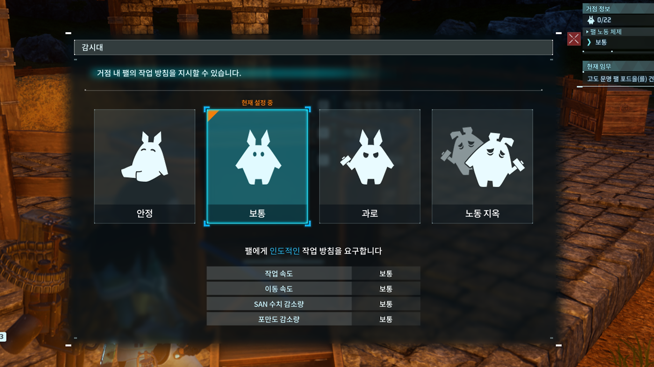 | 팰들 관리 | 작업 환경 | 포만 | 수면 |