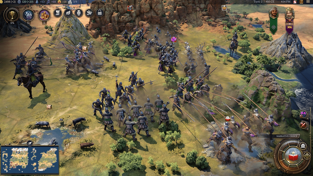그때 그 시대에 있었던 모든 전략과 기술들이 있기 때문에 몇 백시간을 해도 뉴비로 불릴 수 밖에 없는 진입장벽이 굉장히 높은 타입의 게임이지만, 그 진입장벽을 낮추기 위해 자동전투, 전투 건너뛰기 등의 기능이 있습니다.