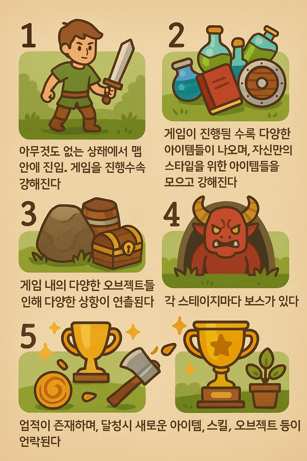 1. 아무것도 없는 상태에서 맵 안에 진입. 게임을 진행할수록 강해진다