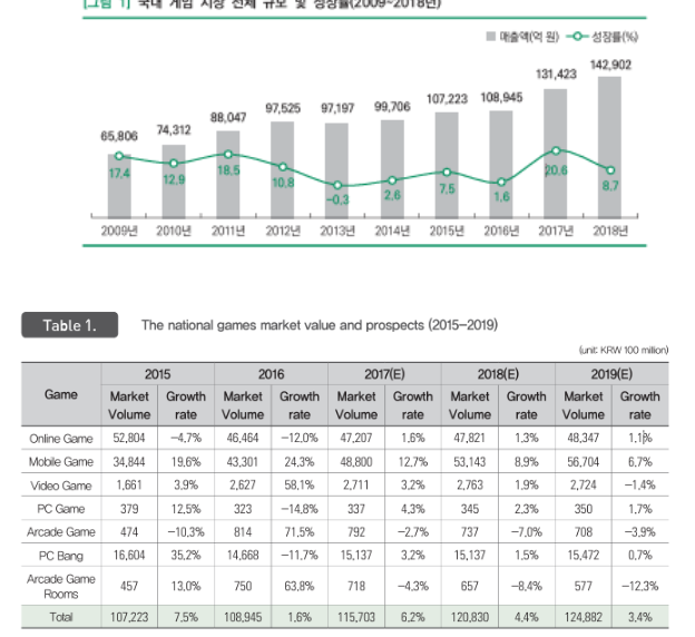 (Figure 1: 게임 시장 성장 추세, Table 1: 게임 플랫폼 별 성장 추세)