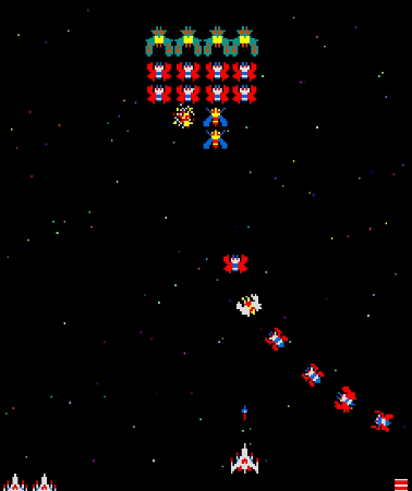 | 등장 | 좌, 상단, 우의 3 방향의 외곽에서 등장 | 적들은 동일한 궤도를 화면 중앙에서 돌며, 일정한 간격을 가지고 그 다음 적도 등장한다. |