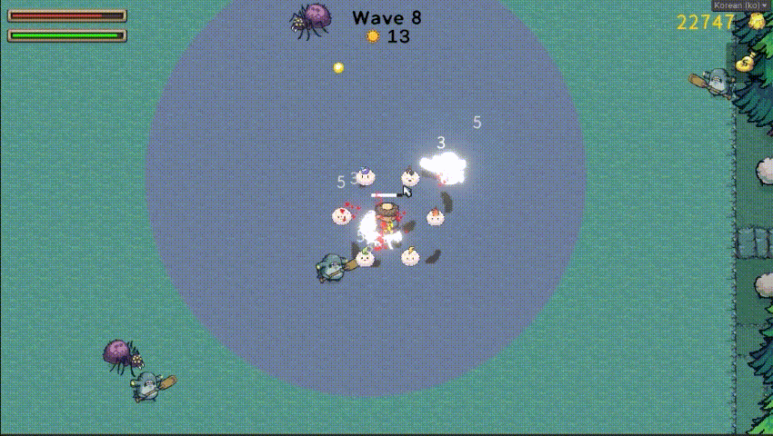 극한의 빌드맛을 느끼게 하기 위해 무기 1개를 매우 강하게 하면 지나치게 웨이브 내에 몬스터들이 클리어 됩니다. 대신에 해당 무기의 이동속도를 매우 낮춰서 플레이어에게 오는 압박감은 어느 정도 유지시키고 싶었습니다.