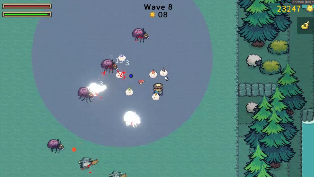 플레이어 주변에 딱 붙어서 따라오는 무기들이 플레이어를 지켜줍니다.